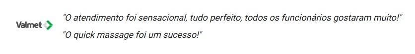 A Quick Massage, por sua vez, traz uma experiência prática que atua diretamente nos sentidos, gerando um reconhecimento real para os colaboradores. Essa é a ação ideal para os profissionais técnicos de segurança do trabalho e RH que buscam fazer mais do que cumprir protocolo.